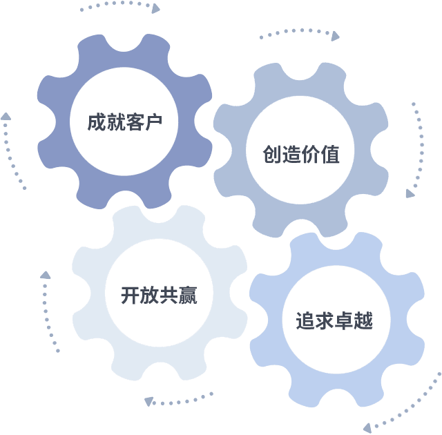 成就客户是一切决策的出发点,,创造价值是衡量所有工作的标准,,,追求卓越是我们做事做人的态度,,,开放共赢是我们的格局也是最终的结果。。。价值观的齿轮环环相扣,,,,推动着组织里的每个人不断向前。。。