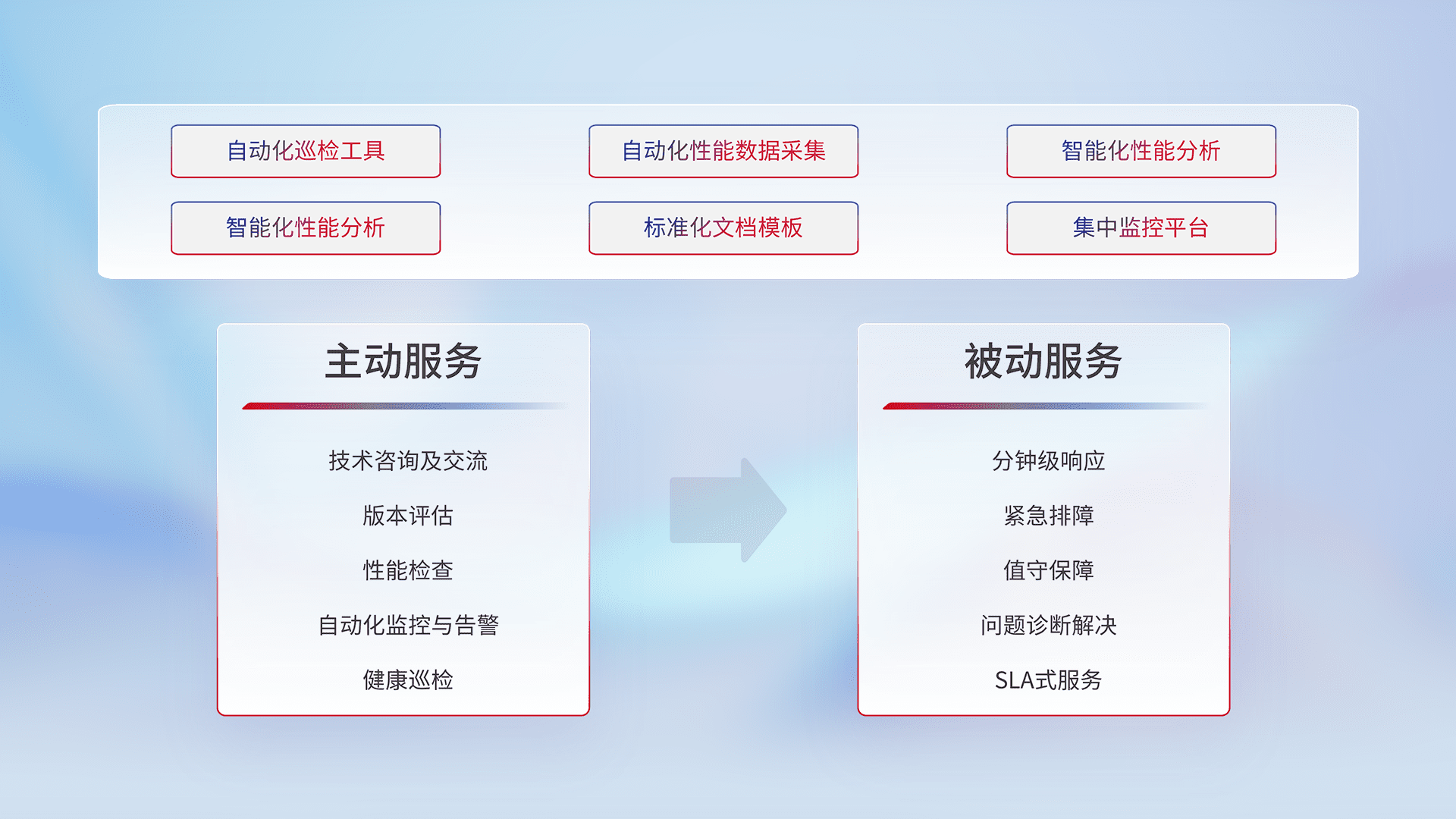 智能化工具和标准化文档,,,保障服务质量,,,,提供主动服务(包含技术咨询、、、、版本评估、、、性能检查、、自动化监控与告警、、、、健康巡检)和被动服务包含(分钟级响应、、紧急排障、、、、值守保障、、、问题诊断解决、、、SLA服务)。。